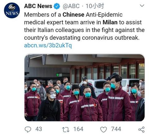 中国专家赴意抗疫的新闻不仅得到了意大利民众的关注,美国传统三大广播电视公司之一的美国广播公司(ABC)也发推报道了这一新闻。他们的推文写道:“中国抗疫医疗专家组的成员抵达米兰,以帮助他们的意大利同事和该国严重的新冠疫情战斗。”