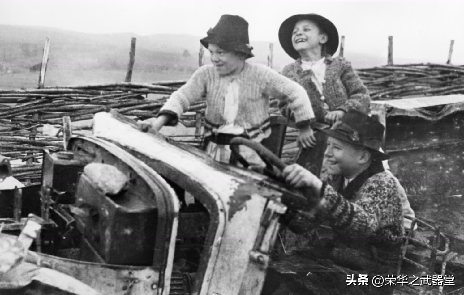 1944年罗马尼亚男孩正在一处解放的村庄玩德国汽车
