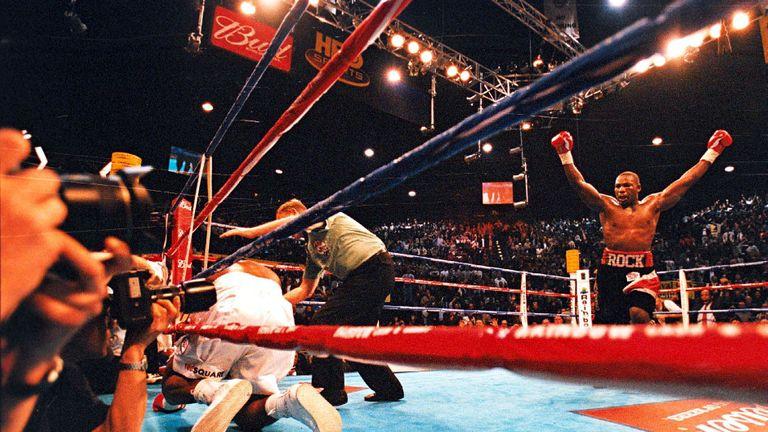 当比赛进行到第五回合时,让人震惊的一幕发生了。哈西姆·拉曼把伦诺克斯·刘易斯逼到了拳击台的围绳边,用一记右勾拳打在了伦诺克斯·刘易斯的下巴上,伦诺克斯·刘易斯庞大的身躯应声倒地。虽然伦诺克斯·刘易斯曾经试图再次站起来,但是他的身体已经不再听从大脑指挥了。于是,在伦诺克斯·刘易斯还躺在地上,不知道发生了什么事的时候。哈西姆·拉曼已经高举双手开始了庆祝。