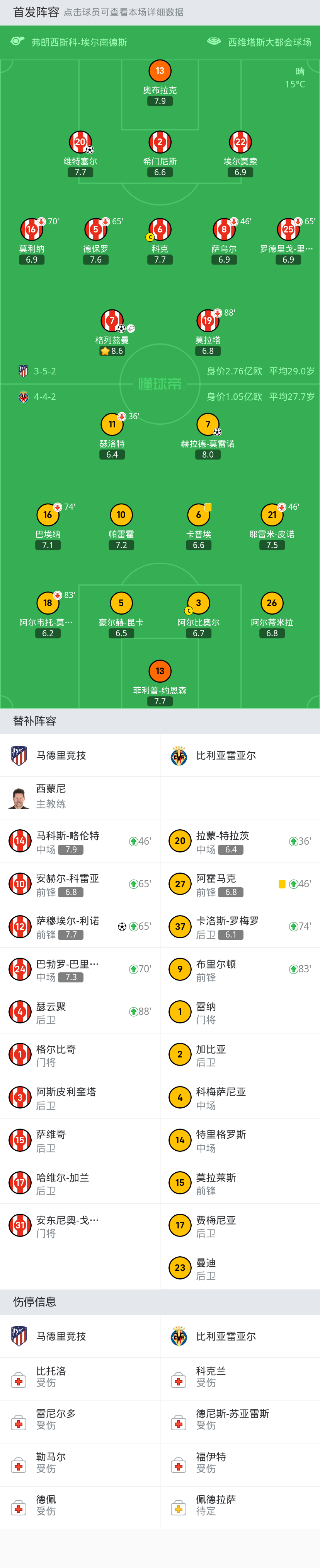 比利亚雷亚尔 首发:3-阿尔比奥尔, 6-卡普埃, 10-帕雷霍, 7-赫拉德-莫雷诺, 18-阿尔韦托-莫雷诺, 11-瑟洛特, 5-豪尔赫-昆卡, 16-巴埃纳, 26-阿尔蒂米拉, 13-菲利普-约恩森, 21-耶雷米-皮诺