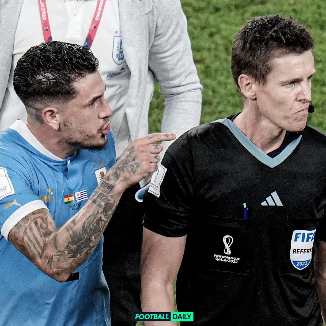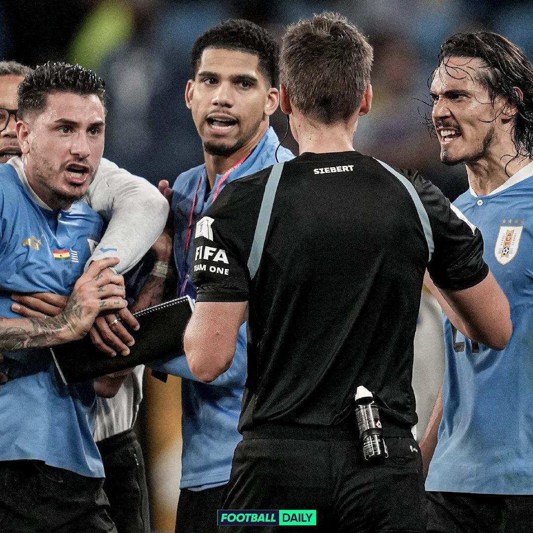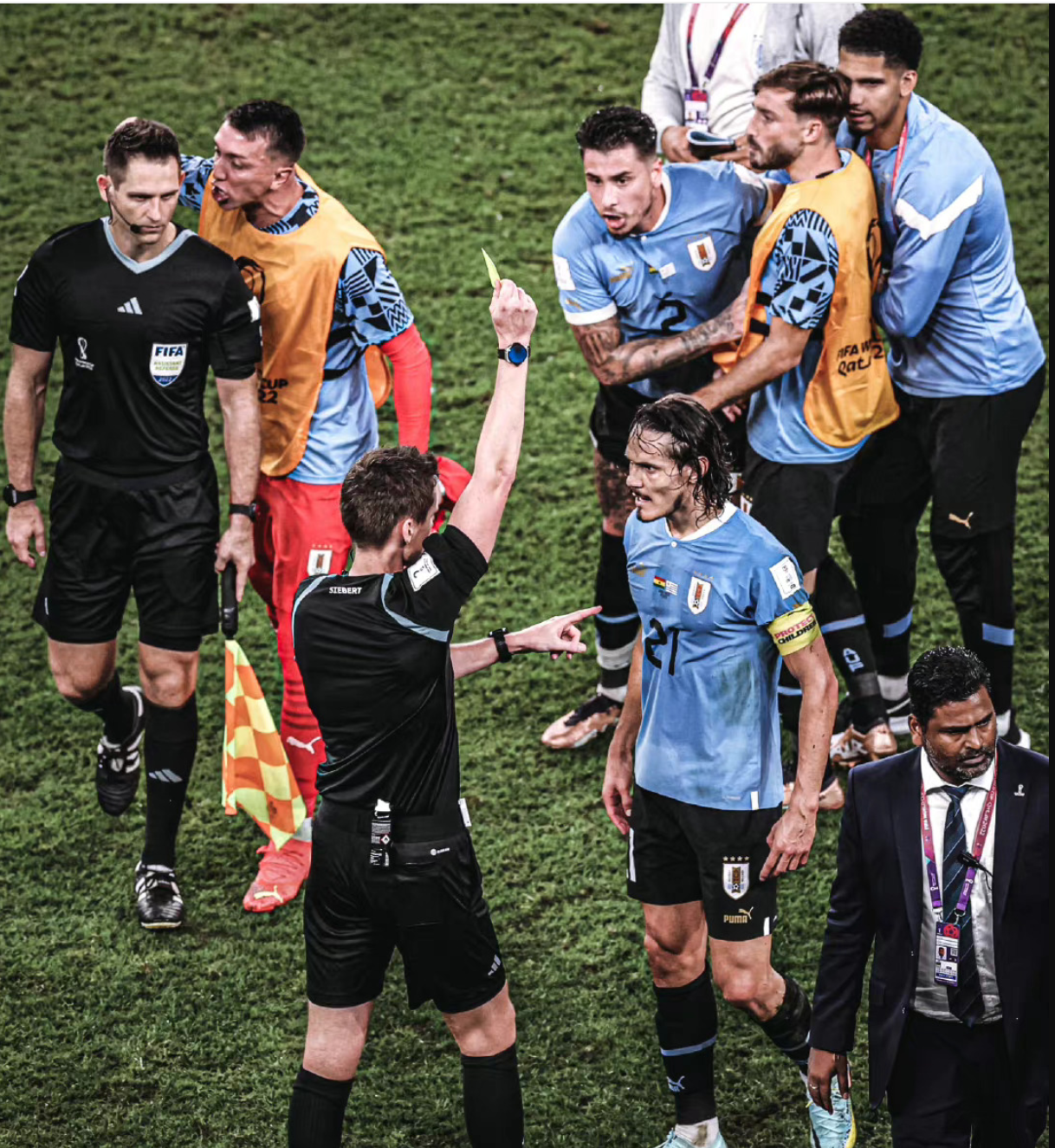 比赛结束后,乌拉圭球员对判罚不满,追着主裁判要说法。因为德国裁判的草率判罚,乌拉圭队赛后不依不饶,在队长卡瓦尼的带领下,众将士将德国人团团围住。卡瓦尼还指向了点球点,质问裁判为何不判点球。