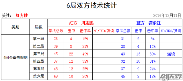 潇杀狂的发挥与首局数据基本一样(28次进攻,4次击中),比较平稳。 意图很明确,分配好6局的体能,不出现大的跌宕起伏。比赛所剩48秒时,场裁提醒周志鹏摆拳技术注意拳锋,避免击打后脑。