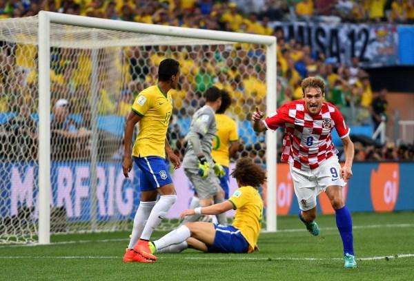 6月12日,巴西队球员马塞洛(右二)在比赛中打入乌龙球。当日,2014年巴西世界杯揭幕战在圣保罗的伊塔盖拉球场举行,东道主巴西队对阵克罗地亚队。 新华社记者 刘彬 摄