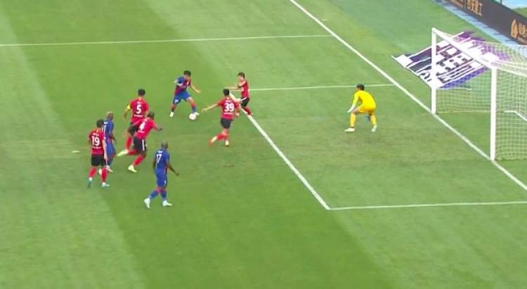 第75分钟,张力角球罚入禁区,头球攻门被马镇扑出,埃里克补射又被挡下,主裁判吹停比赛判罚埃里克冲撞门将犯规。