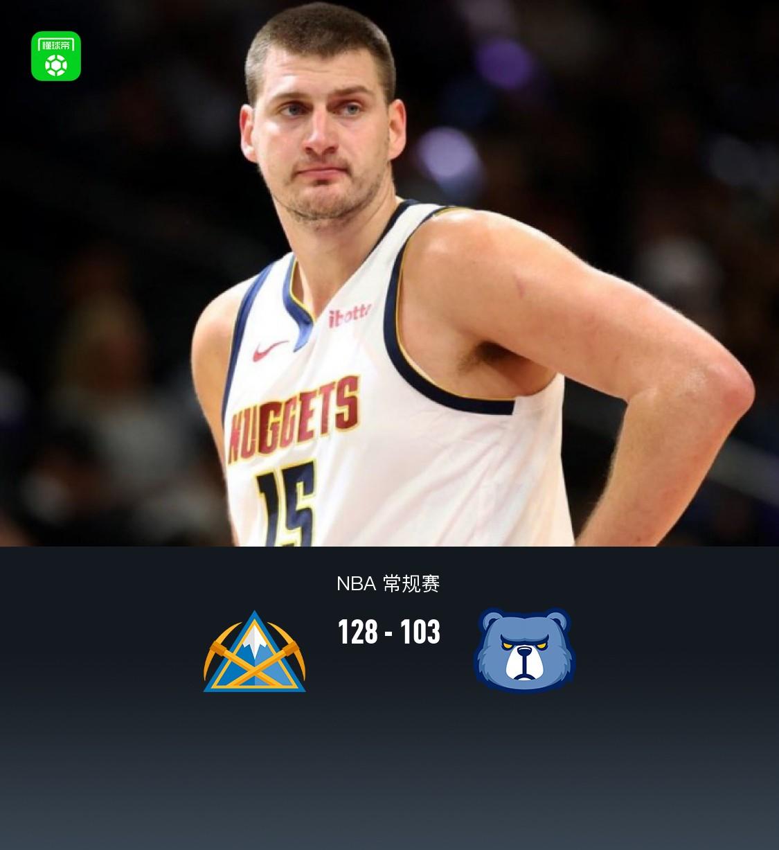 第四节掘金斯特劳瑟拿下7分,灰熊拉马尔-史蒂文斯拿下10分,最终掘金128-103战胜灰熊