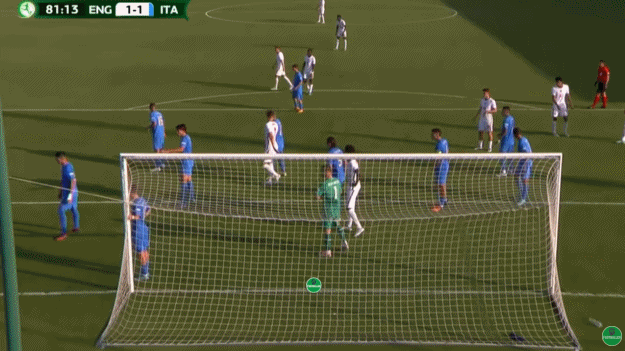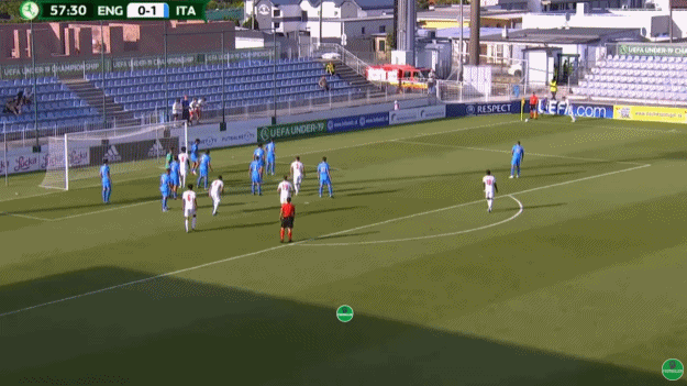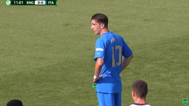 英格兰队开局不力,阿森纳边卫诺顿-卡菲(Brooke Norton-Cuffy)禁区内冒失犯规,送给意大利队点球机会,创造点球的尤文中场、身穿十号球衣的米莱蒂(Fabio Miretti)亲自操刀,右脚低射将球送进球门左下死角,1比0,英格兰队门将、效力于布伦特福德的考克斯(Matthew Cox)扑对了方向,但没能碰到皮球。