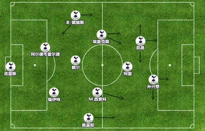 热刺在波切蒂诺时代前期主打4231体系,进攻推进依赖于登贝莱的个人盘带。2016/17赛季中期,波切蒂诺跟风主打三中卫阵型,登贝莱的重要性进一步凸显。从2017/18赛季,登贝莱的出勤率因伤病频发而急剧下滑,波切蒂诺更新了球队的推进系统,凯恩成为了热刺在推进阶段的重要支点。在以凯恩为核心的空地联勤推进模式中,埃里克森和阿里获得了比较宽松的发挥空间,孙兴慜、小卢卡斯和拉梅拉可以更多地来到中路冲击禁区,费尔南多-略伦特也在部分场次中获得了以“真”中锋角色出场的机会。