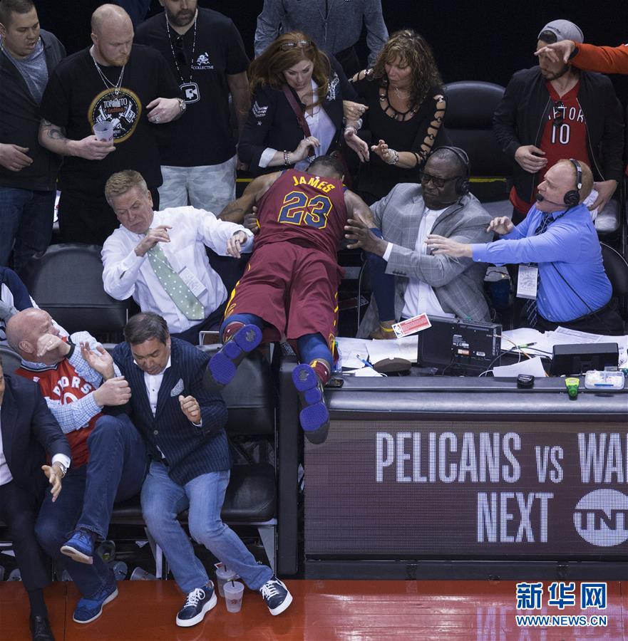 ↑5月1日,骑士队球员詹姆斯(中)在比赛中为救球冲进观众席。新华社记者邹峥摄