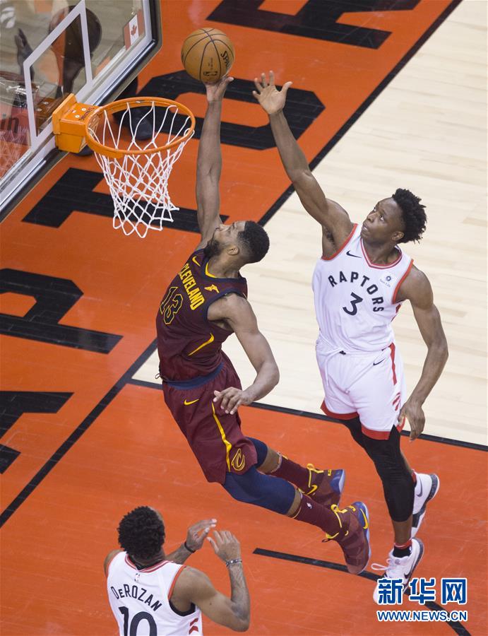 ↑5月1日,猛龙队球员瓦兰西尤纳斯(白衣)在比赛中上篮。当日,在2017-2018赛季NBA季后赛东部半决赛首轮比赛中,克利夫兰骑士队客场以113比112战胜多伦多猛龙队,总比分1比0暂时领先。新华社记者邹峥摄