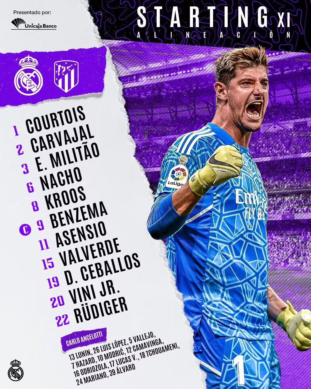 皇马首发:1-库尔图瓦、2-卡瓦哈尔、3-米利唐、22-吕迪格、6-纳乔、15-巴尔韦德、8-克罗斯、19-塞巴略斯、11-阿森西奥、9-本泽马、20-维尼修斯