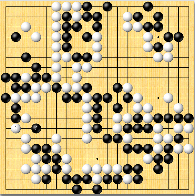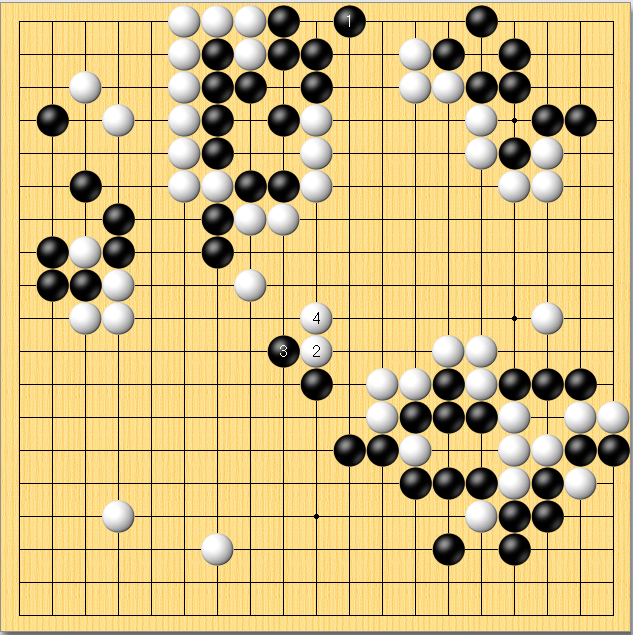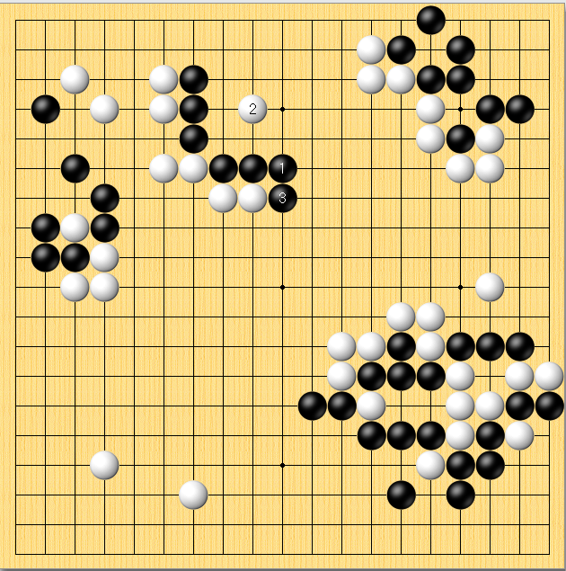 图四(变化图)李世石黑1当长出,千钧之力!白2如果点一手,黑3拐头力拔泰山!如此白棋很难在右上围出大空。不知为何实战李世石要大踏步后撤。