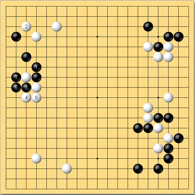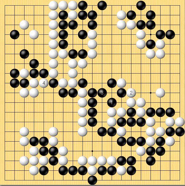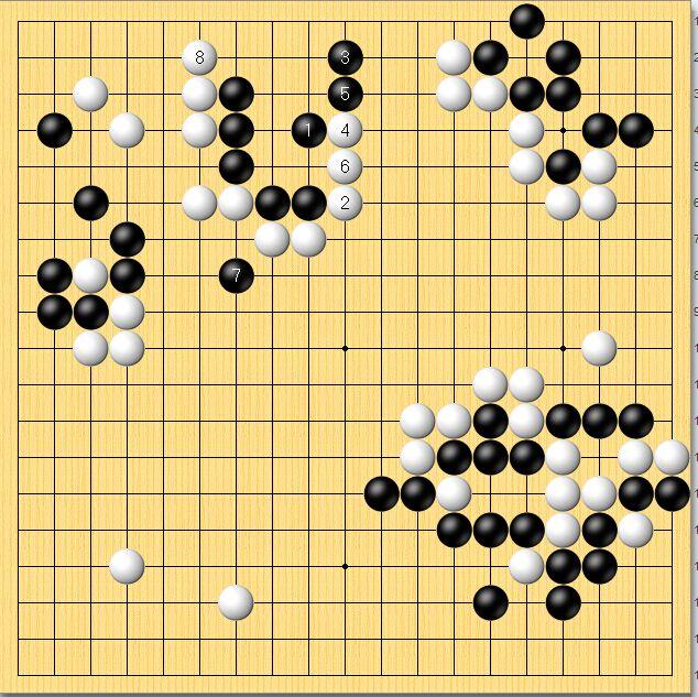 图三(实战图)李世石黑1招致所有观战高手的批评,认为这手棋过缓。阿法狗不失时机地抢占白2扳头要点,顿时右上白棋模样滔滔,黑7点时,白8径直立下,搜刮黑棋,舒服极了。