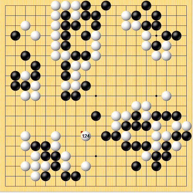 图八(实战图),李世石奋勇在左下打入,阿法狗白124堂堂正正,一石二鸟,漂亮极了!下一步白棋要么在下边二路挡住,闷死黑大块;要么在中腹冲断,追杀黑棋数子。在留下下一步A、B两点见合这点上,阿法狗绝对是高手。聂卫平九段甚至评价:阿法狗的大局比李世石强。