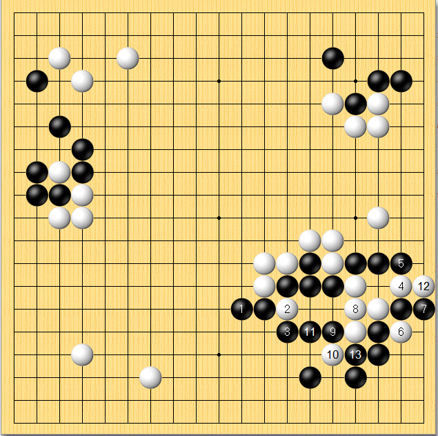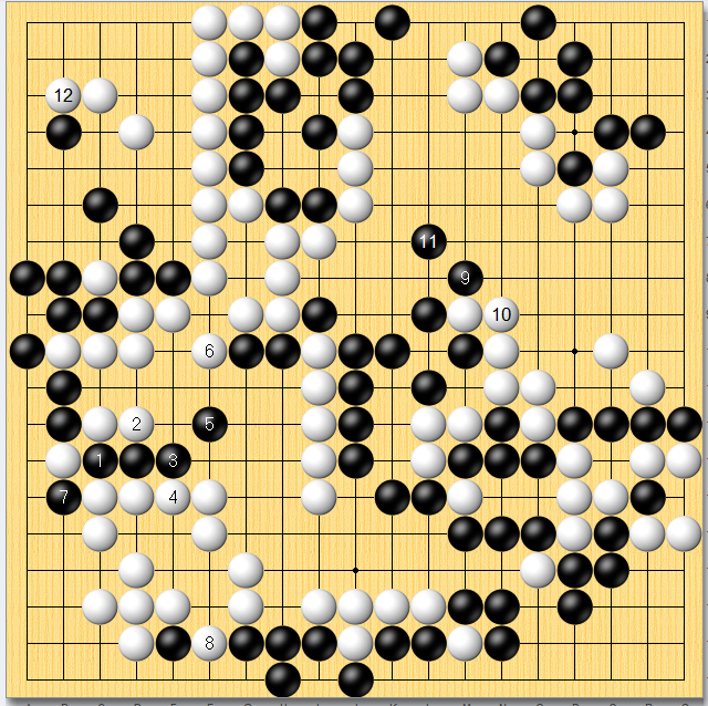 图十一(实战图)黑1至白8形成大转换,黑棋意外略有亏损,败局更是不可挽回。至白12挡住,阿法狗牢牢控制局面,赢定。
