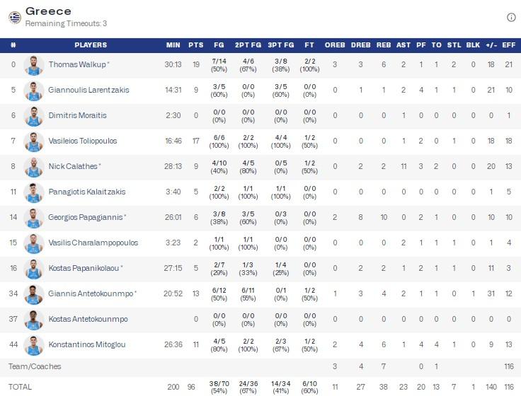 第四节,斯洛文尼亚进攻再度哑火,希腊在字母哥开节短暂上场的情况下轰出18-3将分差拉大至30分以上,斯洛文尼亚东契奇继续在场,至比赛还剩4分多钟才下场休息,全场结束,希腊男篮96-68大胜斯洛文尼亚