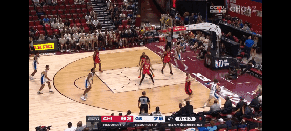 第四节一上来勇士进攻依然依靠犀利的进攻,大比分遥遥领先公牛队,波杰姆斯基突破暴扣。