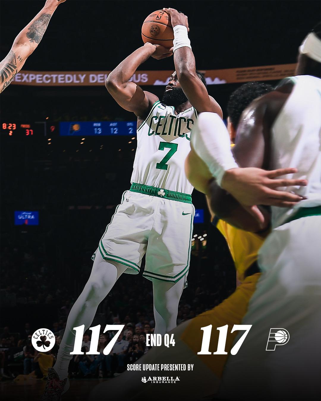 决胜时刻,布朗底角命中绝平三分,哈利伯顿三分不中,双方进入加时赛。