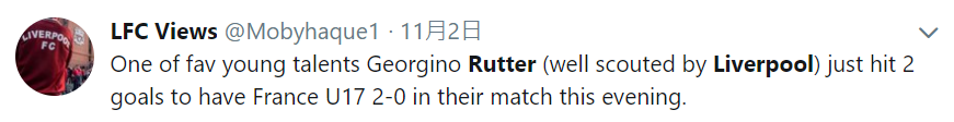 U17世界杯正在火热进行中,这届赛事也是各家俱乐部观察青年才俊的大舞台:对于人才济济的法国U17来说,球队里的明星们自然会得到不少关注,据推主LFCViews报道,身披9号的前锋鲁特尔(Geroginio Rutter)正是利物浦关注的年轻球员之一,这位17岁的雷恩前锋刚刚在对阵海地的小组赛最后一轮上演一分钟内梅开二度的好戏。