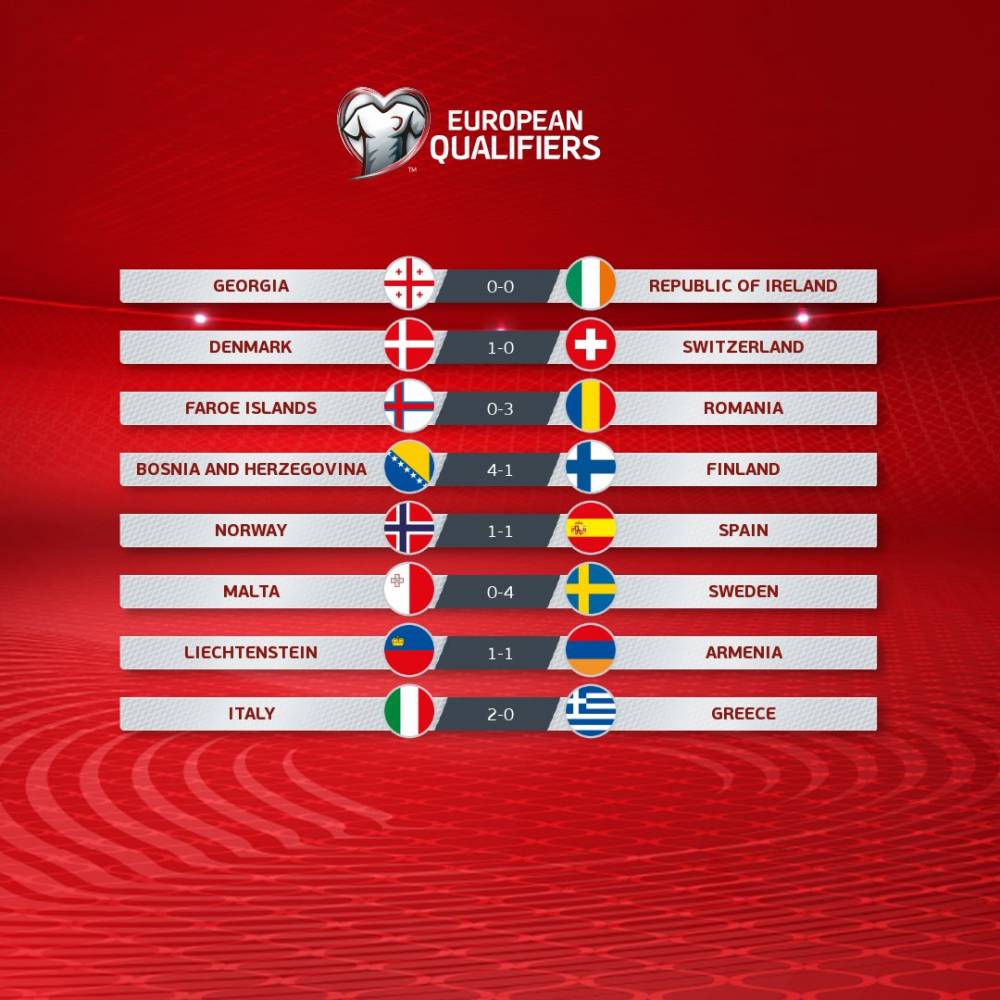 比赛中格鲁吉亚控球占优,但未能觅得破门良机,双方0-0战平。本场比赛后,爱尔兰排名D组榜首,6场比赛打进6球失2球。