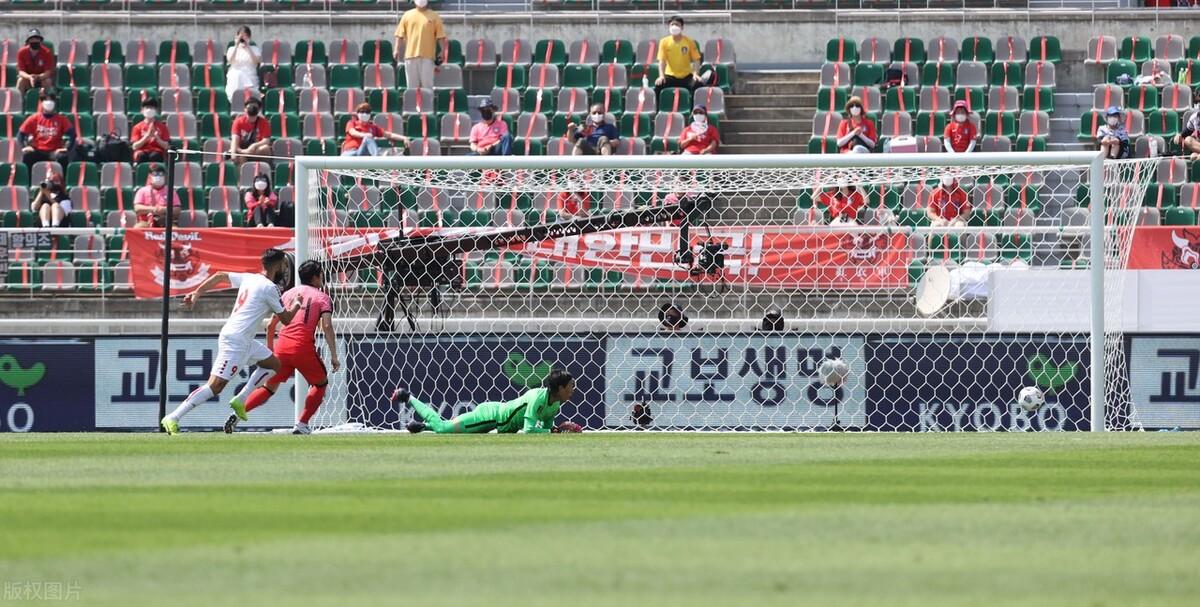 第51分钟,利用角球机会,宋敏圭的头球攻门,打在对手后卫身上入网,太极虎扳平比分,1-1。