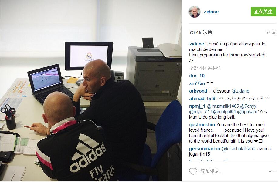 在教练岗位上齐达内是一个工作狂,这些都被弗洛伦蒂诺看在眼里。从皇马助教到B队主帅,法国人一直都在用同一间办公室,除了办公必需品外还有一个沙发,两个简单的椅子,这些都很少用到。穿上印有ZZ(齐达内名字的缩写)的训练服,齐达内坐在自己L形的办公桌前,将笔记本连到大屏幕,跟助教贝托尼一起分析下一个对手的比赛录像,日复一日。同样是光头,贝托尼是齐达内在戛纳时便结下的好伙伴,成为教练之后他们再次走到了一起。