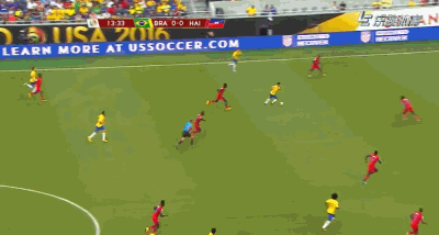 第32分钟,威廉漂亮的连续突破,塞给左路插上的库蒂尼奥,直接推射远角,被门将倒地将球没收。第35分钟,海地门将开球失误直接将球传给了阿尔维斯,阿尔维斯右路直接起球传中,禁区中央奥古斯托高高跃起甩头攻门,皮球飞入球门右上角,3-0!