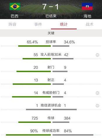 海地的防守并没有给巴西制造什么麻烦,全场比赛桑巴军团攻势如潮,并取得了7个进球。