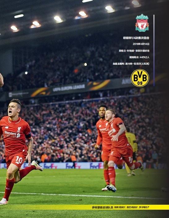 北京时间4月15日03:05(英国当地时间14日19:05),2015/16赛季欧联杯1/4决赛次回合一场焦点战在安菲尔德球场展开角逐,利物浦主场4比3逆转胜多特蒙德。姆希塔良、奥巴梅扬和罗伊斯先后进球,奥里吉、库蒂尼奥和萨科进球扳平,洛夫伦补时绝杀。利物浦总比分5比4晋级。