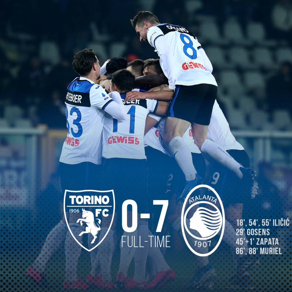 亚特兰大客场7-0血洗都灵,这是亚特兰大队史意甲最大比分胜利,都灵则遭遇了队史主场最惨失利。