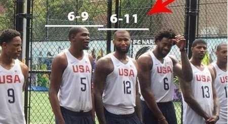 杜兰特的身高也是谜一样的存在。刚进联盟的时候,杜兰特的身高是2米06,然而在美国队集训时期,杜兰特在合影中比身高2米11的考辛斯还要高!不知道是考辛斯报高了,还是杜兰特报矮了,亦或是两个人都虚报了身高呢?(Repo)