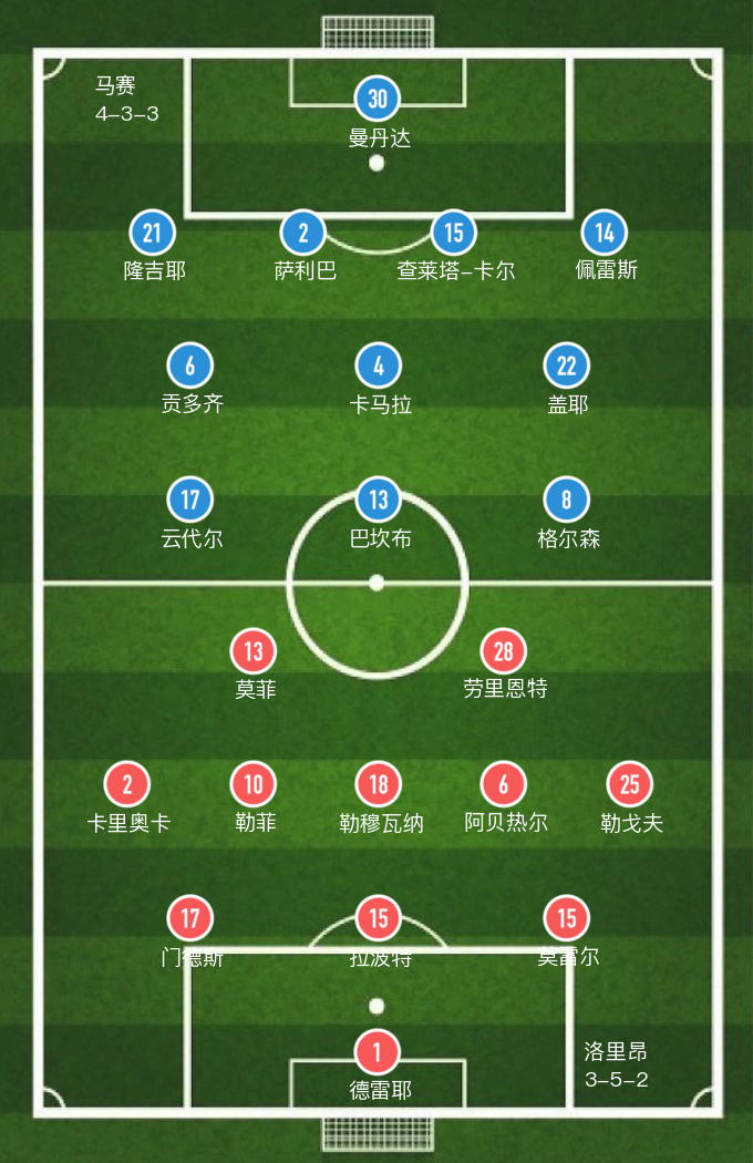马赛(4-3-3): 30-曼丹达,21-隆吉耶,2-萨利巴,15-查莱塔-卡尔(53' 23-科拉希纳茨),14-佩雷斯,6-贡多齐,4-卡马拉,22-盖耶,17-云代尔,13-巴坎布(17' 12-迪昂),8-格尔森(70' 29-利罗拉)