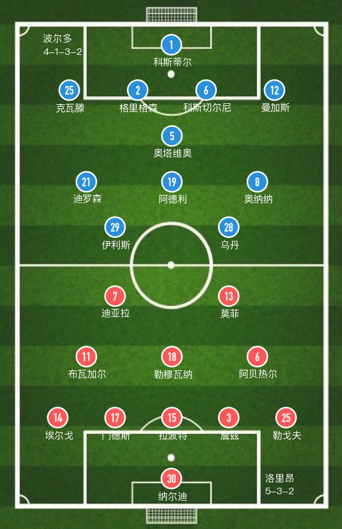 波尔多(4-1-3-2): 1-科斯蒂尔,25-克瓦滕,2-格里格森,6-科斯切尔尼,12-曼加斯,5-奥塔维奥,21-迪罗森(90' 弗朗塞乔),19-阿德利(90' 彭贝莱),8-奥纳纳,29-伊利斯(90' 马拉),28-乌丹(90' 门萨)