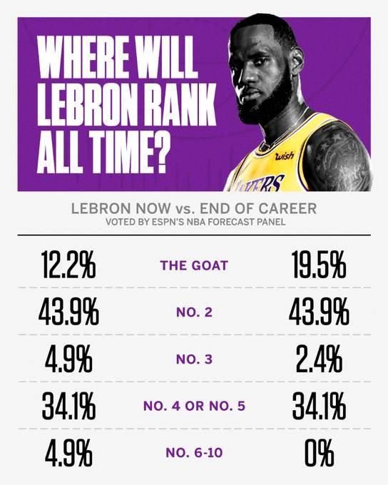 直播吧7月23日讯 近日,美媒邀请专家团对湖人球星詹姆斯现在和未来退役后的历史排名进行投票预测。
