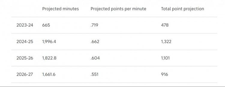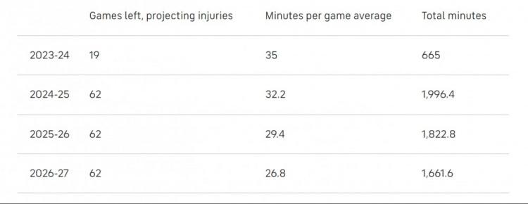 因此,我们将采用场均出场时间每年下降2.8分钟的趋势,并认为詹姆斯每年都将缺席大约20场比赛,下表是詹姆斯本赛季剩余时间和未来三个赛季(到2026-27赛季为止)的预计出场时间 :