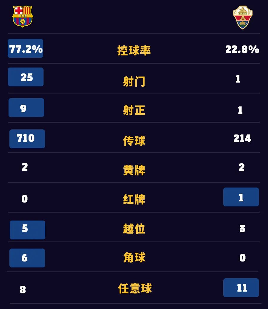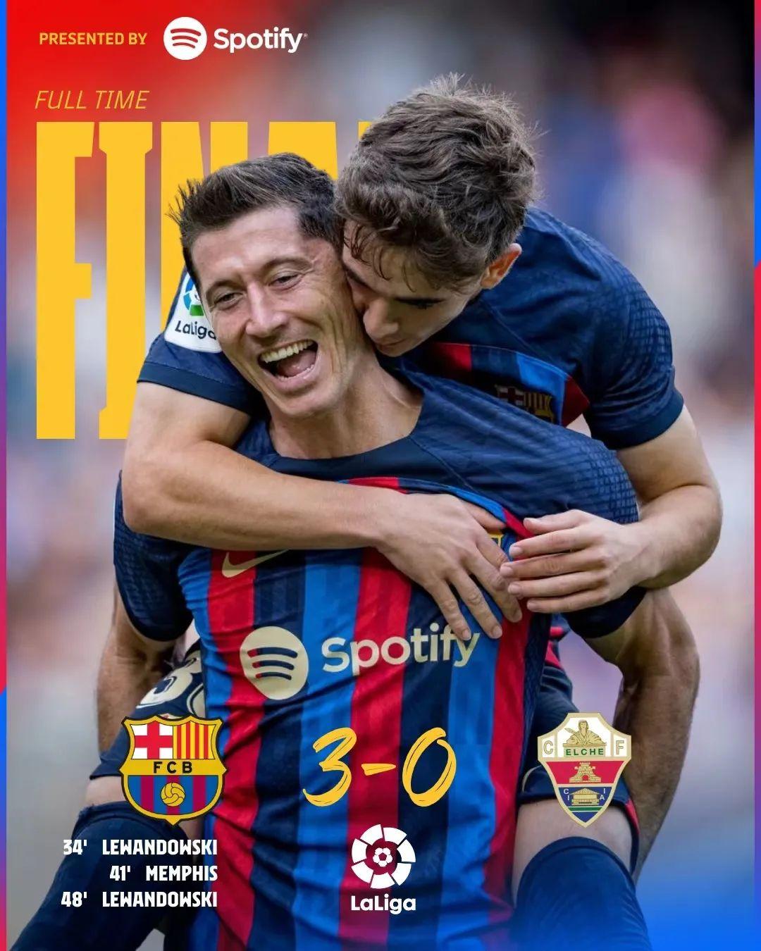 全场比赛结束,巴萨主场3-0战胜埃尔切,全取三分!