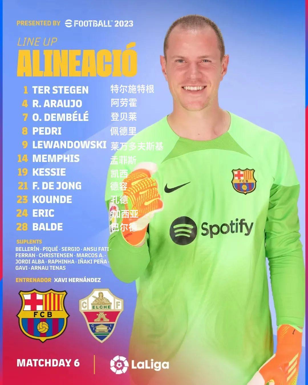 中场:8-佩德里,19-凯西(46'30-加维),21-德容