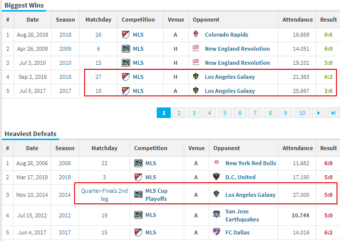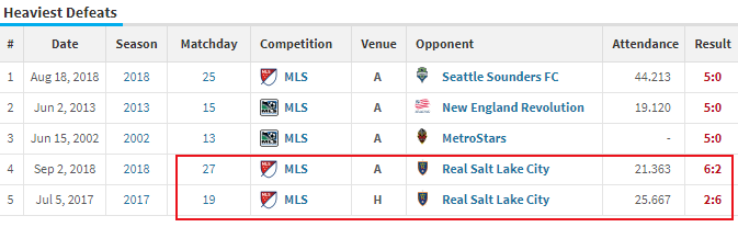 洛杉矶银河历史前5场惨败里,有2场都是皇家盐湖城制造的,分别是在2017年和2018年,而这2场胜利也进入到皇家盐湖城队史5大胜利中,不过盐湖城的队史第3惨失利也是银河送的,2014年美职联季后赛1/4决赛次回合,银河5-0横扫皇家盐湖城。