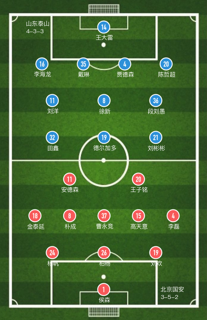 山东泰山(4-3-3): 14-王大雷,16-李海龙(56' 6-王彤),35-戴琳(61' 33-金敬道),4-贾德森,20-陈哲超(56' 39-宋龙),11-刘洋(56' 7-郭田雨),8-徐新,36-段刘愚,32-田鑫(46' 15-齐天羽),19-德尔加多,21-刘彬彬