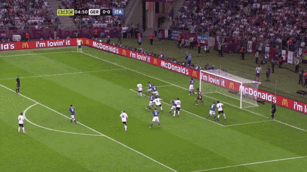 开场后,德国率先抢攻。第五分钟,克罗斯开出左侧角球,无人防守的胡梅尔斯六米外左脚凌空垫射,穿布冯小门后被皮尔洛在左门柱挡住。