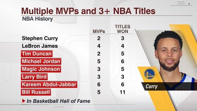 值得一提的是,截至目前,联盟历史上仅有8位球员取得过至少3次总冠军和多次MVP。他们分别是:库里、詹姆斯、邓肯、乔丹、(魔术师)约翰逊、拉里-伯德、贾巴尔和比尔-拉塞尔。