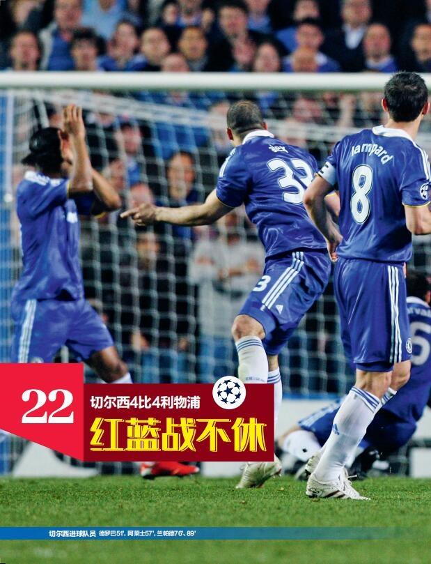 只是红军的希望并没有维持太久,5分钟后,兰帕德就在禁区内起脚,皮球击中左侧立柱后弹入,本场4比4,总比分7比5。德罗巴骄傲地做出了比赛悬念已经杀死的庆祝手势,此后利物浦虽有替补恩戈射门逼出埃辛充任“门线天使”的表演,但比分再无改变。而对于几乎所有球迷而言,这强悍无休的节奏、梅花间竹的进球、最后揭晓的悬念,都凝聚成一场美好记忆。