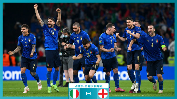 第五轮,意大利队若日尼奥主罚被扑出,英格兰队萨卡主罚被扑出。意大利队夺冠!