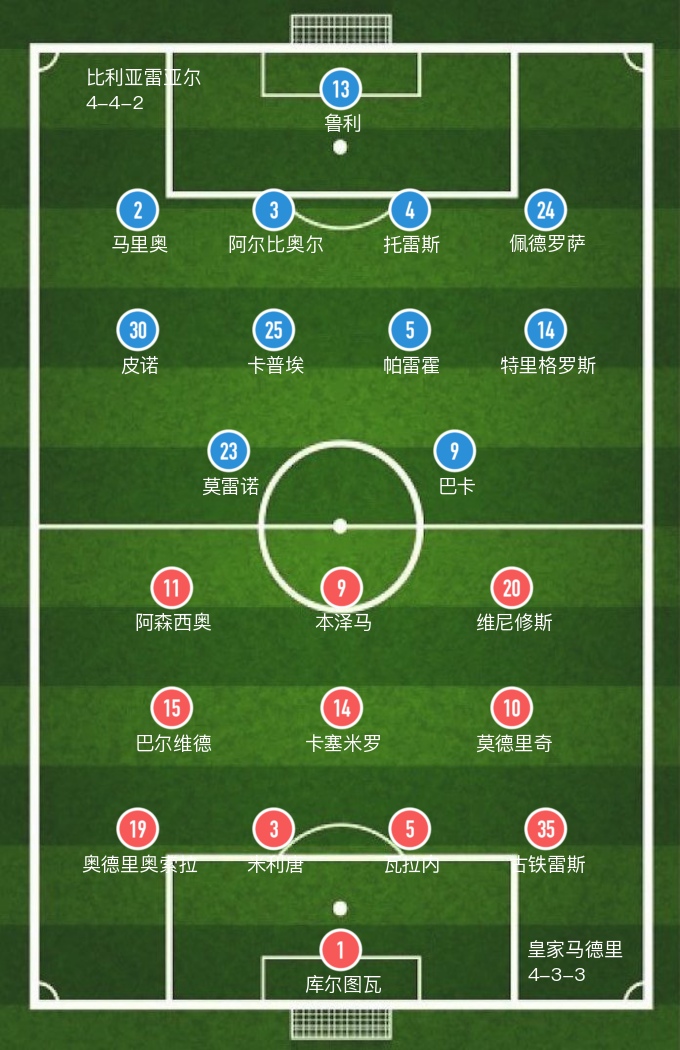 皇家马德里(4-3-3): 库尔图瓦,奥德里奥索拉(68' 马塞洛),米利唐,瓦拉内,古铁雷斯(68' 费尔南德斯),巴尔维德,卡塞米罗(68' 迪亚兹),莫德里奇,阿森西奥(56' 伊斯科),本泽马,维尼修斯(56' 罗德里戈)