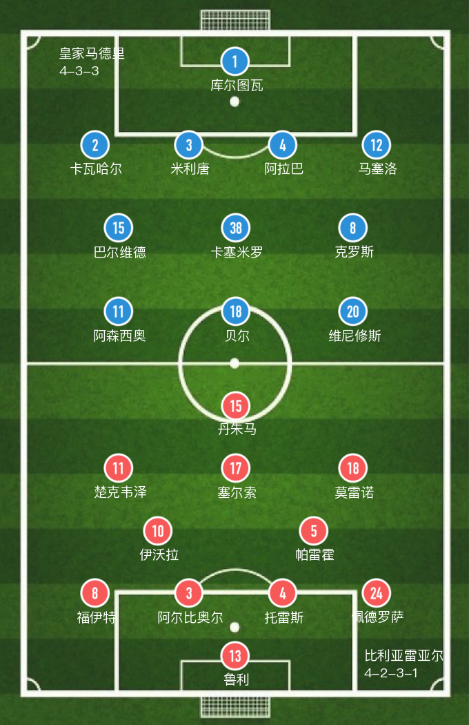 皇家马德里(4-3-3): 1-库尔图瓦,2-卡瓦哈尔,3-米利唐,4-阿拉巴,12-马塞洛(82' 6-费尔南德斯),15-巴尔维德(78' 10-莫德里奇),38-卡塞米罗,8-克罗斯,11-阿森西奥(78' 21-罗德里戈),18-贝尔(74' 16-约维奇),20-维尼修斯(82' 7-阿扎尔)