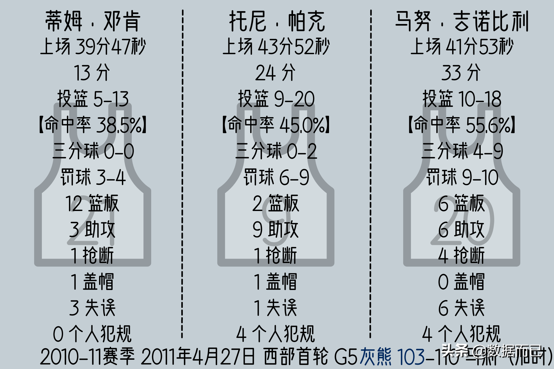 以下6图为2010-11赛季季后赛西部首轮(马刺2:4灰熊)——"GDP"每场比赛个人数据: