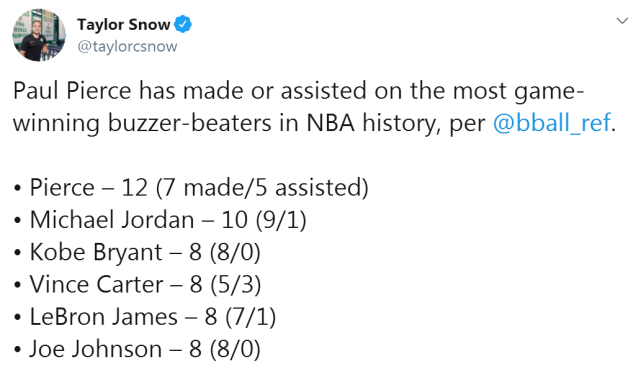 另外,记者Taylor Snow还公布了另外一份压哨绝杀的榜单,关于球员执行或者助攻压哨绝杀的排名。在这份榜单上,皮尔斯高居第一,因为他不但完成7次压哨绝杀,还助攻过5次压哨绝杀,总次数12次排名榜首。其他5位排名如下(括号内前为压哨绝杀次数,后为助攻压哨绝杀次数)——