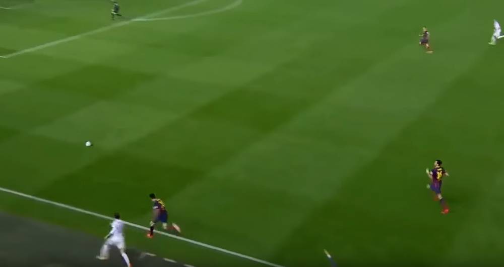 比赛第85分钟,皇马后场防守化解巴萨的进攻,科恩特朗接到伊斯科的传球后,便顺给贝尔。接下来就是威尔士人的个人秀了,贝尔一脚将球向前踢出20米。面对已经启动提速的贝尔,巴萨后卫巴尔特拉利用身体将其撞出边线,在所有人都认为这次进攻会就此结束时。