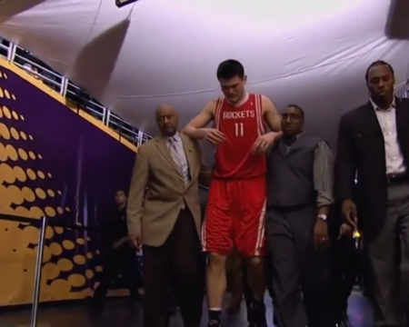 一米九的身高硬被推上大前位置无奈只能用手捂对方眼睛的海爷(虽然这几位都是响当当的有自己签名鞋的主~)再加上我们耳熟能详脍炙人口被国人称作一代传奇巨星的姚明!