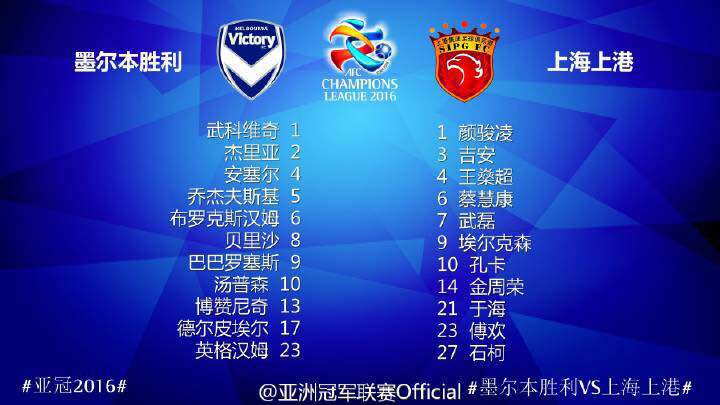 北京时间2月24日16:45,2016赛季亚冠联赛小组赛G组首轮比赛,上海上港客场对阵澳大利亚墨尔本胜利。在赛前公布的首发阵容中,吉安、孔卡和埃尔克森联袂出场。