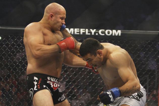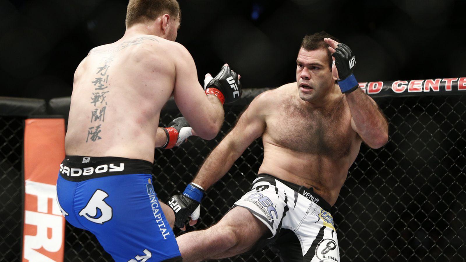 2007年战警转战UFC,首战告捷之后,当年4月被名不见经传的大胖子加布里埃尔-冈萨加(上图右)高扫KO,以自己熟悉的方式输掉了比赛。战警在进入MMA之前曾经打过站立格斗的比赛,还参加过K1安迪-哈格的纪念赛。2010年-2012年之间,战警经历了一波三连败,遗憾告别了UFC赛场。